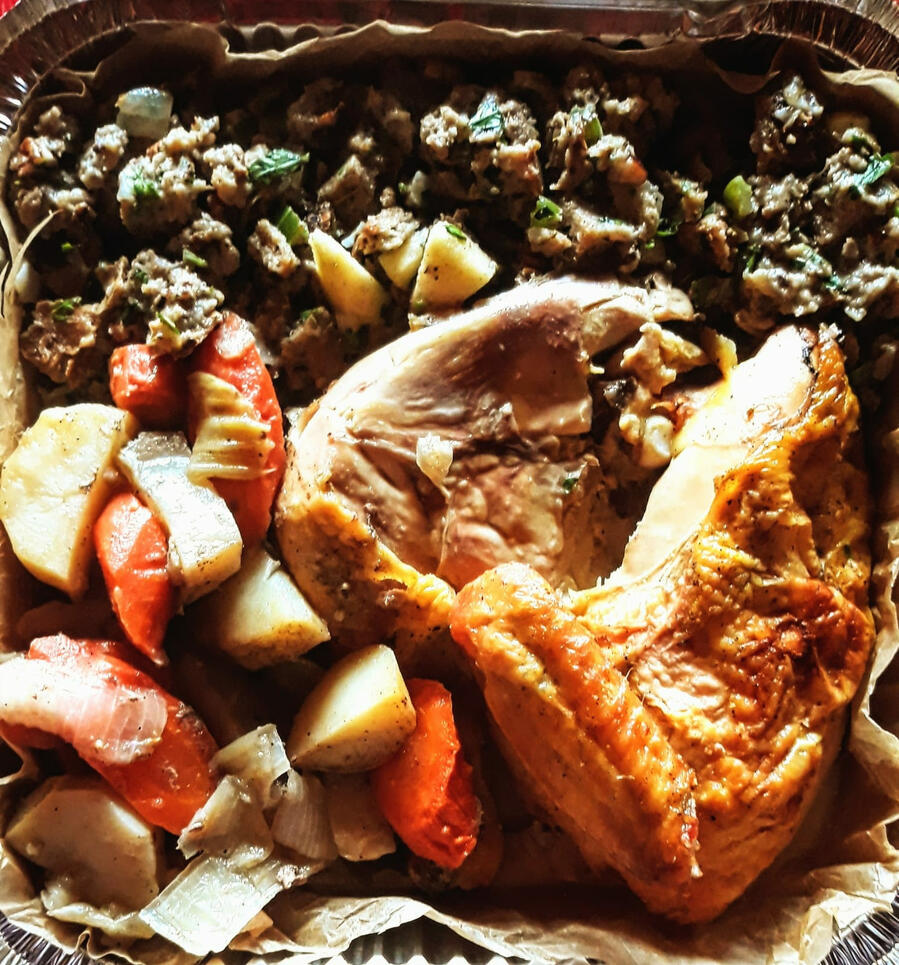Chicken Dinner Tray, a quarter of a perfectly roasted chicken, our home-made bread, sage, onion, sausage & apple dressing, roasted root vegetables and plenty of beautiful chicken gravy.