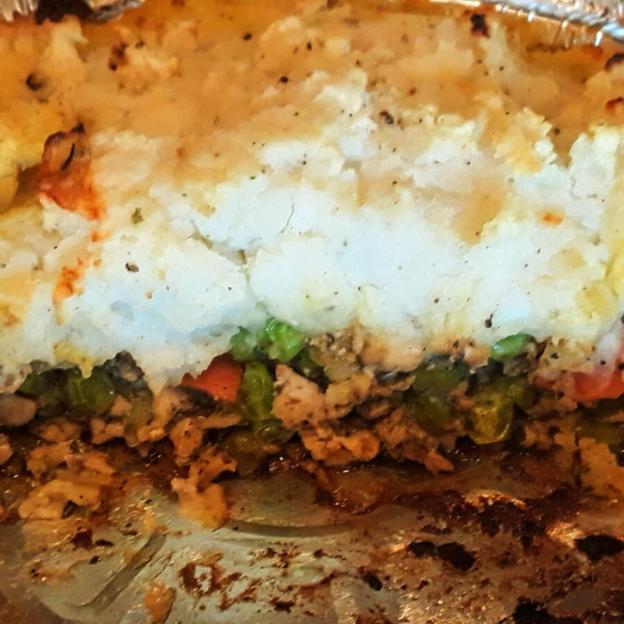 Ground turkey, peas, carrots and onions in a savory sauce under a thick topping of slightly chunky yet creamy, seasoned mashed potatoes.