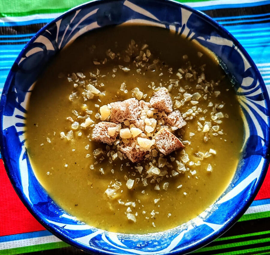 Clear vegetable stock (onions, carrots, celery, potatoes, leeks, corn, bell pepper, mushrooms, green chile, parsley, bay) peas, onion, carrots, celery, vegetable stock, herbs, seasonings, chile de árbol