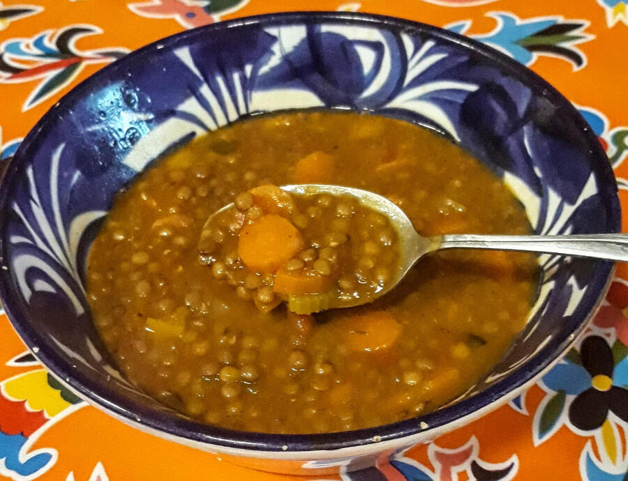 $350 2-3 servingsMediterranean Lentil Soup, Mediterranean style and vegan, we start with flavorful home-made vegetable broth (contains mushrooms), add lentils, ripened tomatoes (we keep them until they’re absolutely ripe before using them) & a chorus of vegetables along with Levantine spices to create the most luscious lentil soup.