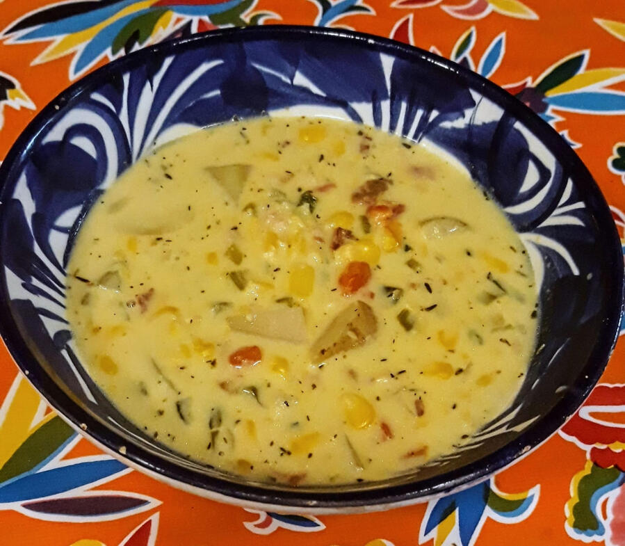 Corn, milk, chicken stock, potatoes, bacon, onions, chile Poblano, red bell pepper, cream, celery, flour, butter, garlic, herbs, salt, black pepper