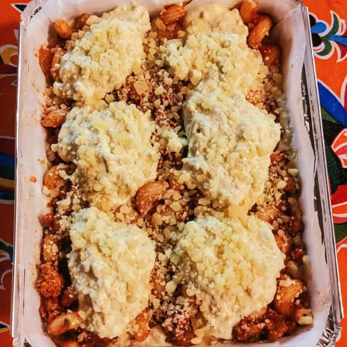 $400 4-6 servings ONLY ONE LEFTRiccioli Al Forno pasta bake with our Italian Southern Style Sausage made with ground turkey in a delicious red sauce made with San Marzano tomatoes & basil with curly macaroni type Rummo Riccioli Pasta in between layers of ricotta, parmesan & mozzarella cheeses with a touch of nutmeg. Ready to bake at home fresh