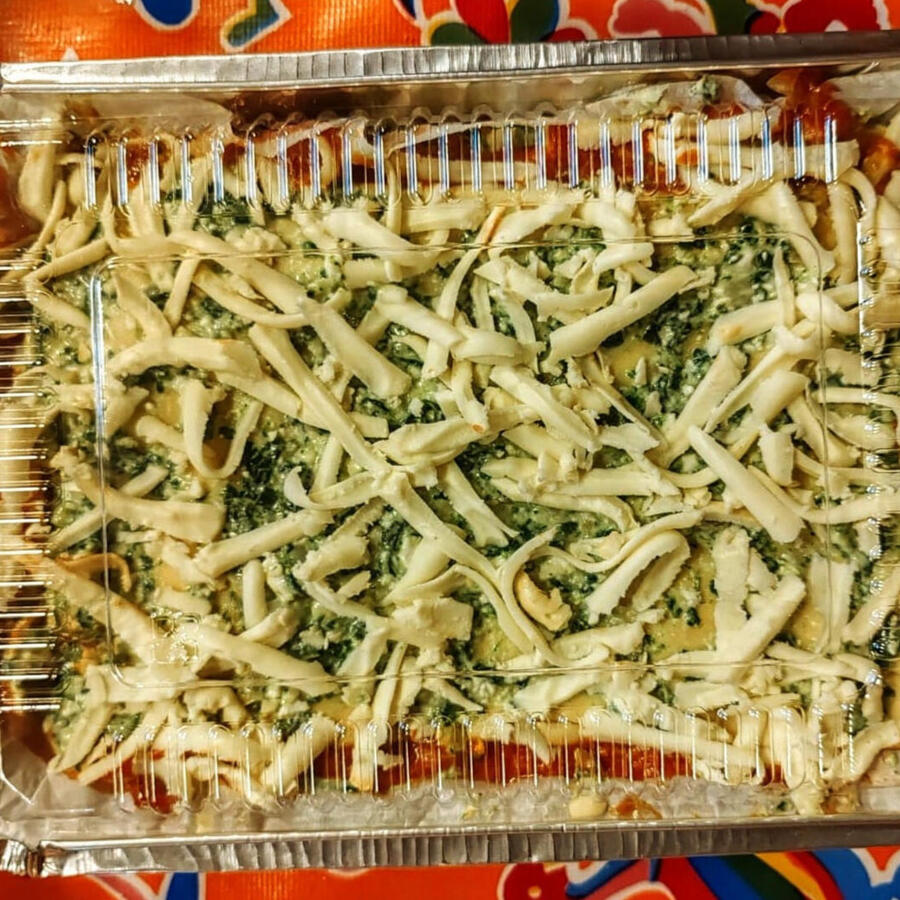 Vegetarian, layers of DeCecco pasta filled with alternating layers of red sauce made with Italian San Marzano tomatoes grown on the slopes of Mt Vesuvius, locally grown spinach & cottage cheese & parmigiano cream. Ready to bake fresh from frozen.