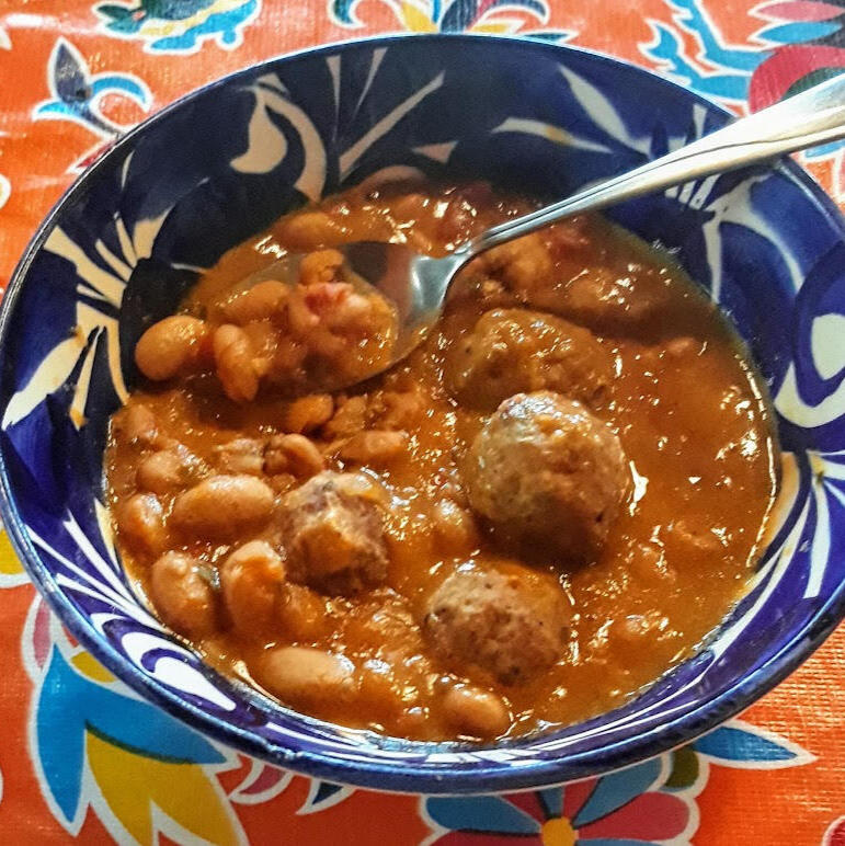 Slow-cooked big white beans made with San Marzano tomatoes grown on the slopes of Mt Vesuvius, onions, garlic, and white wine with our beautiful little Calabrian-style sausage meatballs.