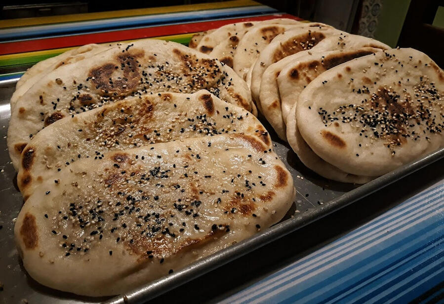 Our Fluffy soft, Pita Bread is made the traditional way with yogurt and extra virgin olive oil and topped with sesame seeds, then cooked on a hot metal griddle which dapples it with the delicious dark scorch marks.