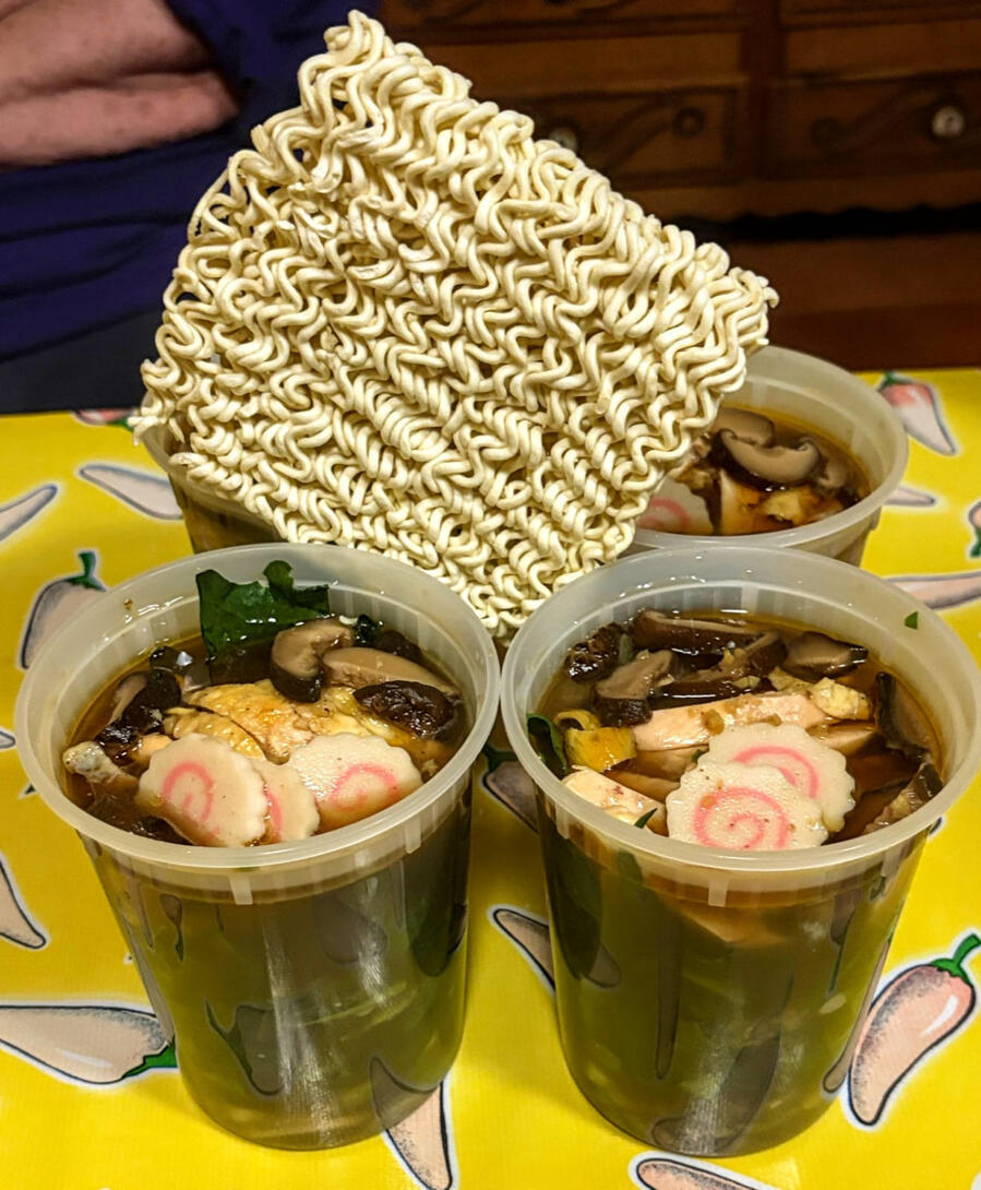 THAW BEFORE HEATING. Cover ramen noodles in boiling water & leave until just soft but still a bit firm about 5 minutes. Drain the noodles & place them in your soup bowl. Heat the soup until just boiling then pour it over the noodles & let sit a few minutes.