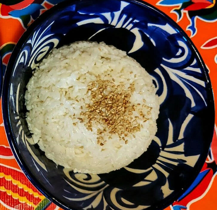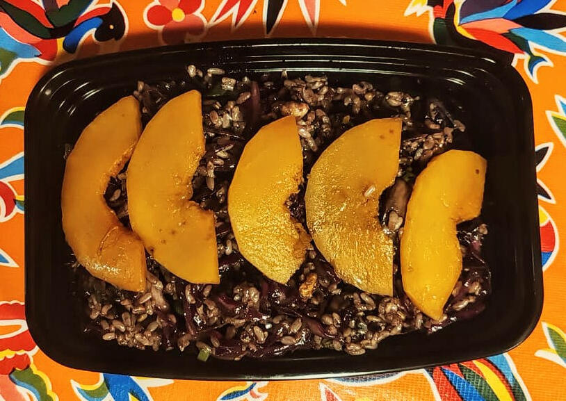 Japanese Autumn Rice a savory stir fry of California-grown short grain brown rice with thin ribbons of red cabbage, red onions, toasted walnuts & sesame seeds, portobello mushrooms, scallions, ginger & garlic topped with sliced Butternut Squash. All in a Japanese seasoned soy sauce with a hint of wasabi & toasted sesame oil. A warm comforting & complete meal or a lovely side dish. Vegan