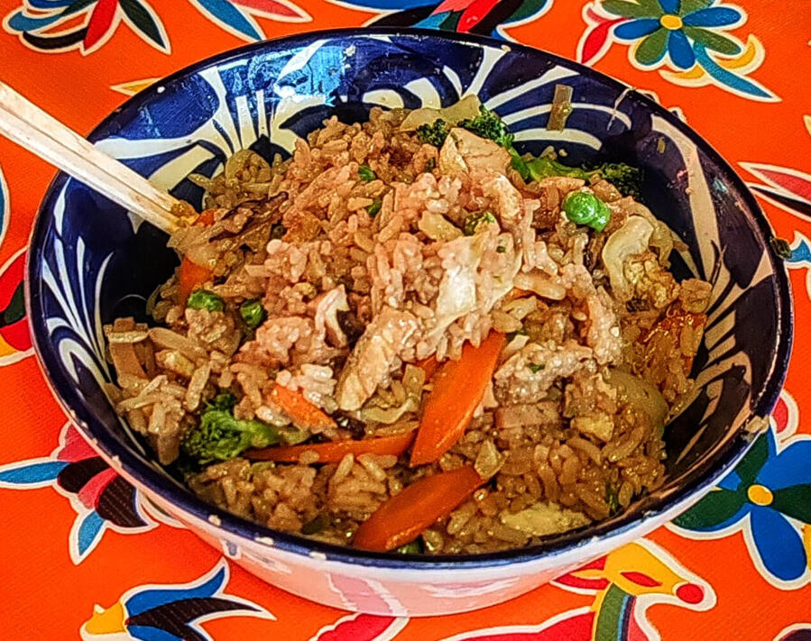 *Jasmine & plain white rice, tofu cabbage, peas, carrots, green onions, jicama, broccoli, eggs, onions, black mushrooms, sugar, oyster sauce, soy sauce, sherry, garlic, hoisin sauce, spices,