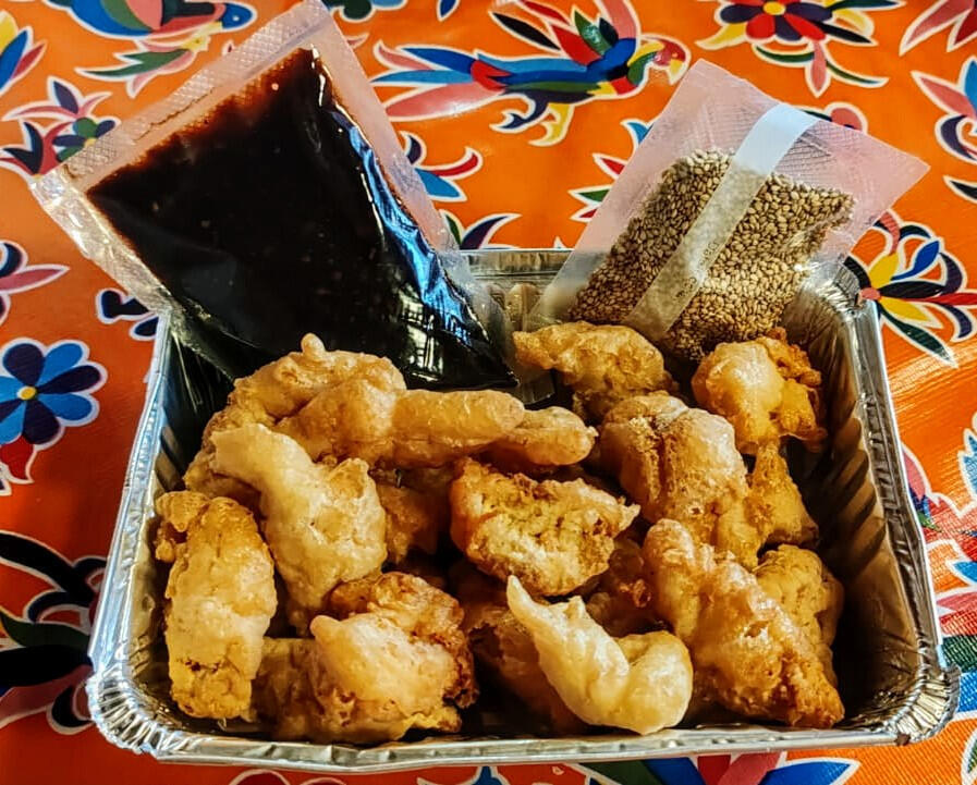 Tender little pieces of marinated chicken covered in a delicate, light, crispy batter. The tangy sauce packet is separate, so you can add it to the crispy chicken to pour it over the Jasmine rice. A cute little packet of toasted sesame seeds is included to finish your dish.