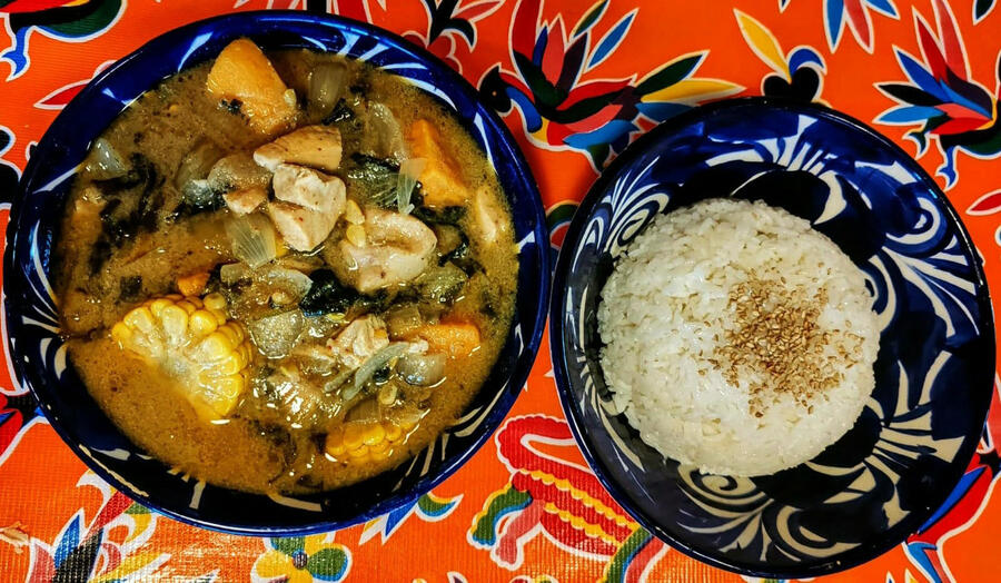Traditional yellow hand-made coconut milk curry with chunks of orange sweet potato, onions, half-moons of fresh sweet corn, chicken breasts and NOW baby spinach. A second container of steamed Jasmine Rice is provided.