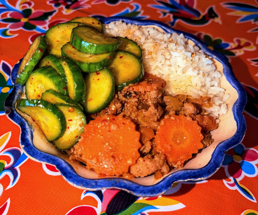 $400 4-6 servingsKorean Bulgogi Rice Bowl Kit, our Bulgogi is on the mild side for everyone to enjoy. Minced turkey in a mildly spicy, savory, sweet & sour sauce with vegetables (no Kimchi here). An envelope of pickle brine is provided to make your own pickled cucumbers in 20 minutes. A separate container of steamed Jasmine Rice & a packet of toasted sesame seeds.